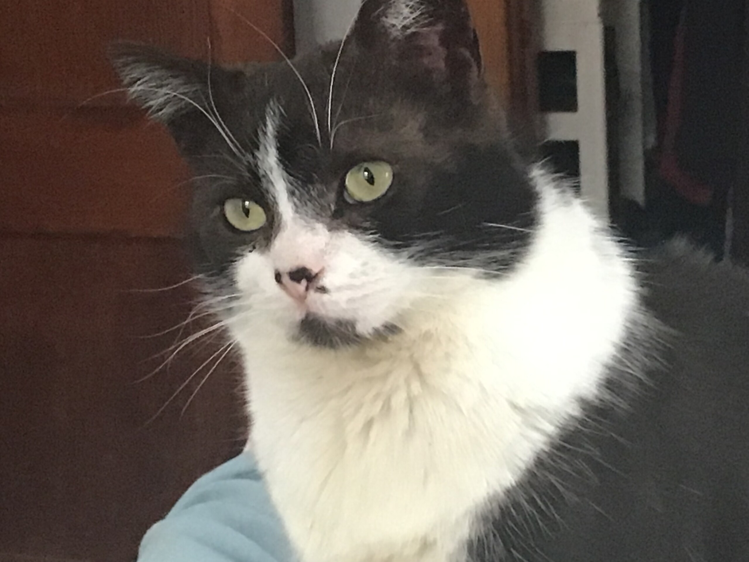 Grey and white 9 year old male cat. He’s big (not fat) about 18 lbs.