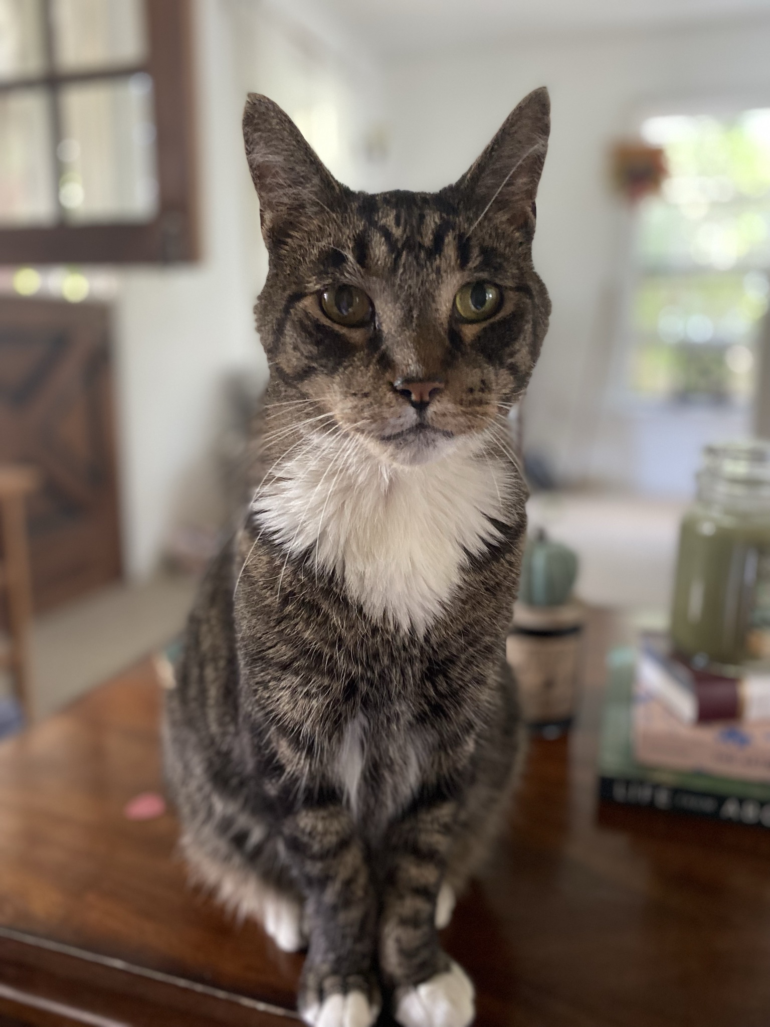 Brown,tan, black striped cat with white paws & white on her chest.