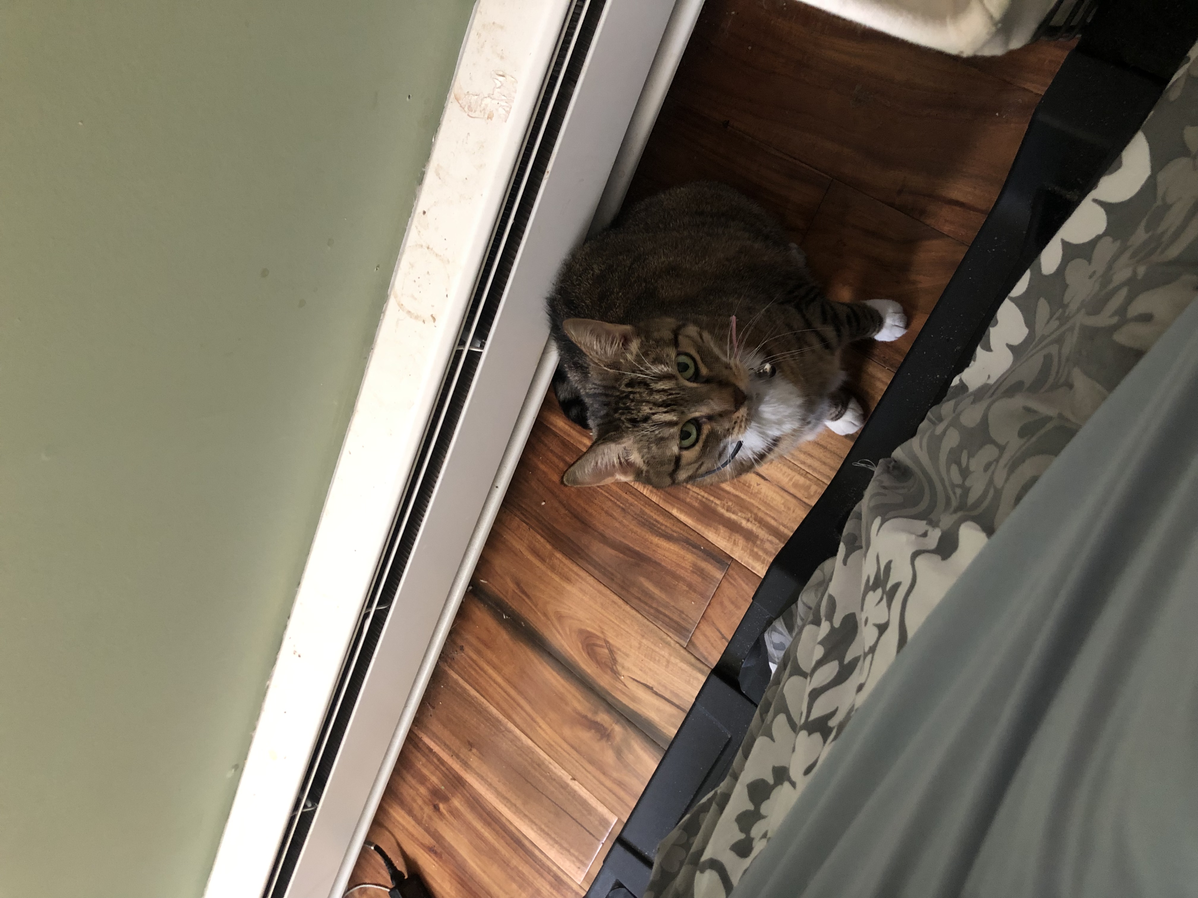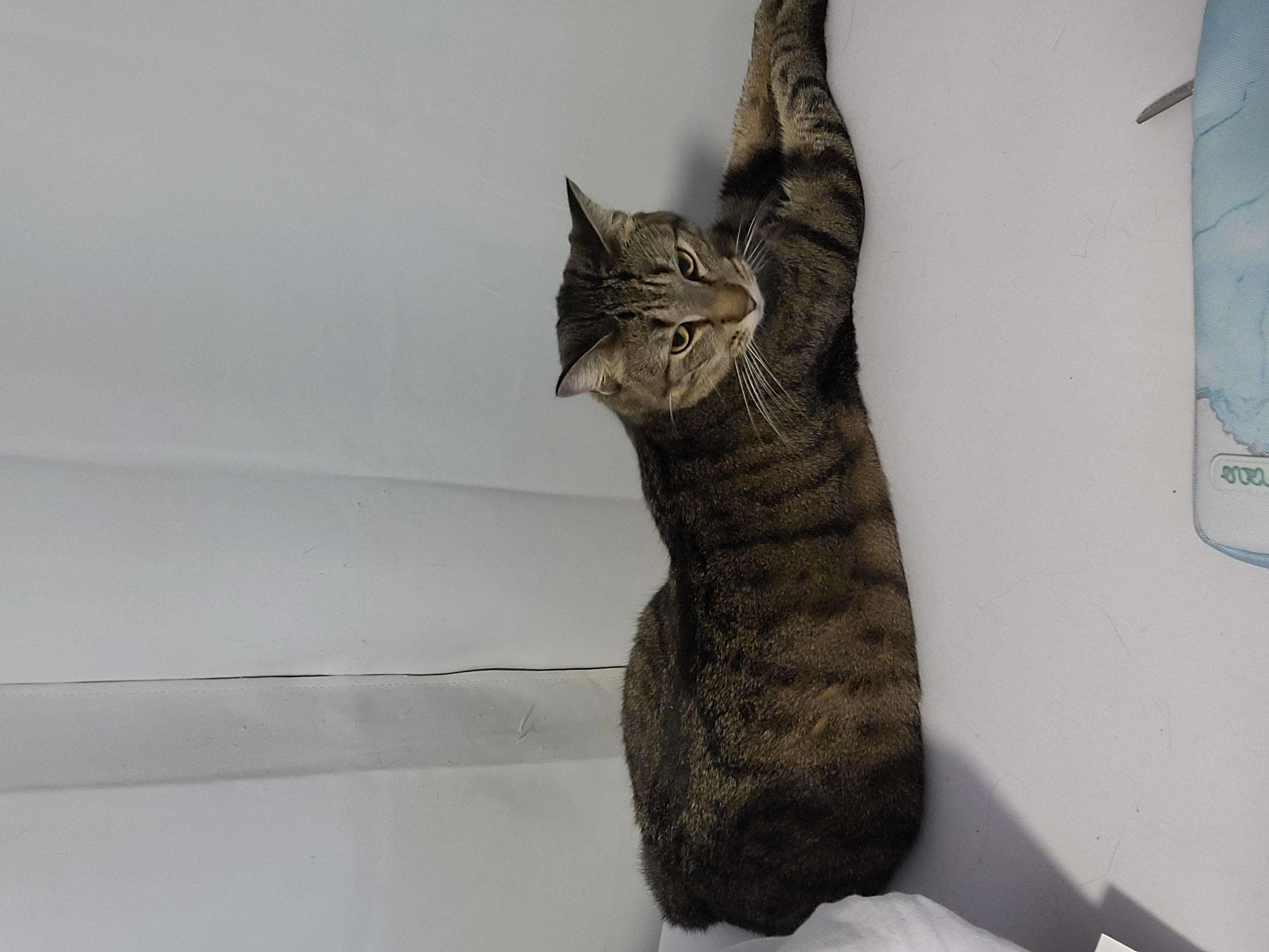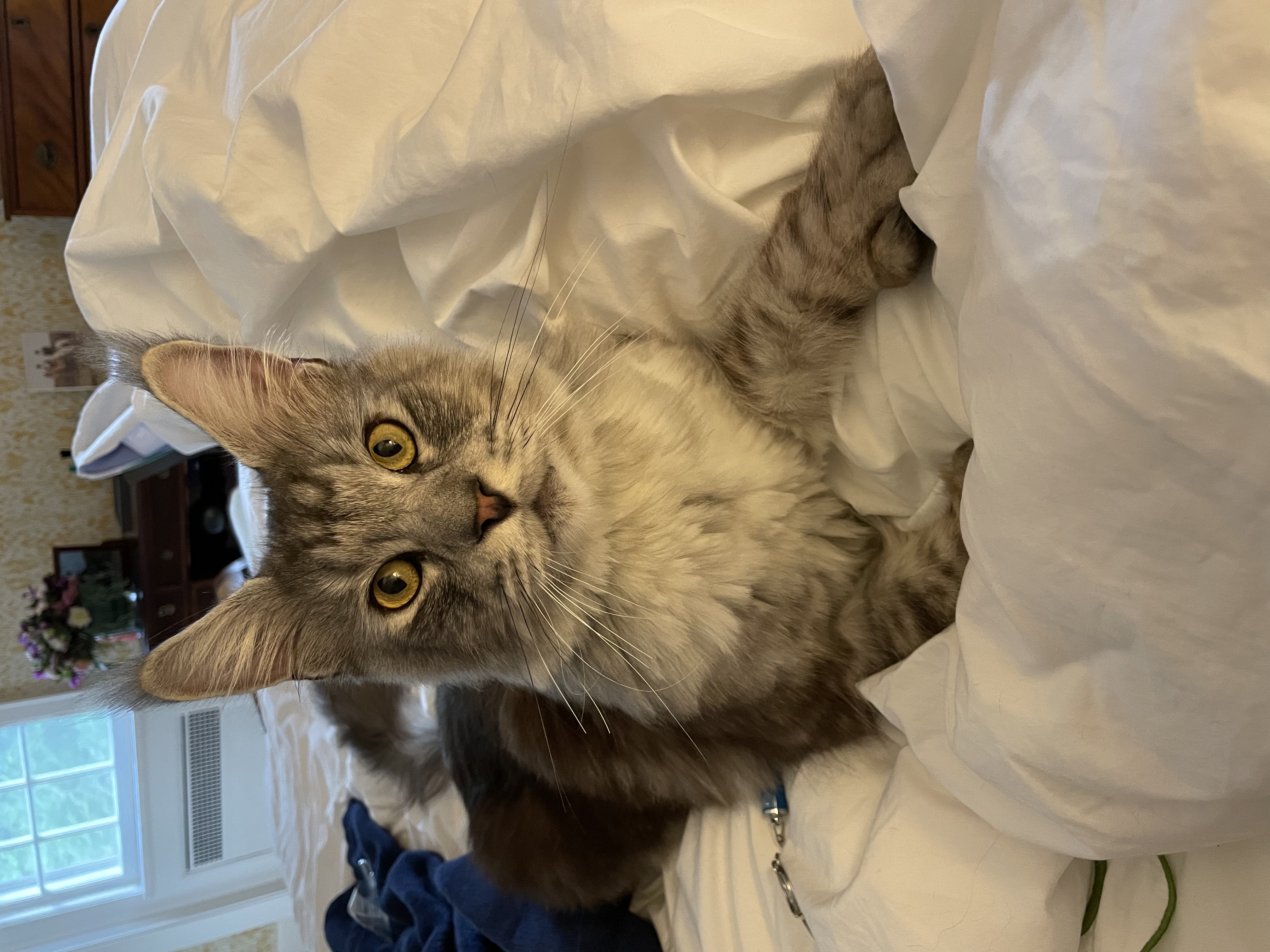My cat Silverpine escaped our home in Poughkeepsie on Oct 17 between 6:30 and 9:00 PM. She is a short-haired grey tabby with white chest, stomach, and socks (shorter on the front paws, longer on the back). Her nose is brownish, and her tail is tipped in black. She is an indoor-only cat and we