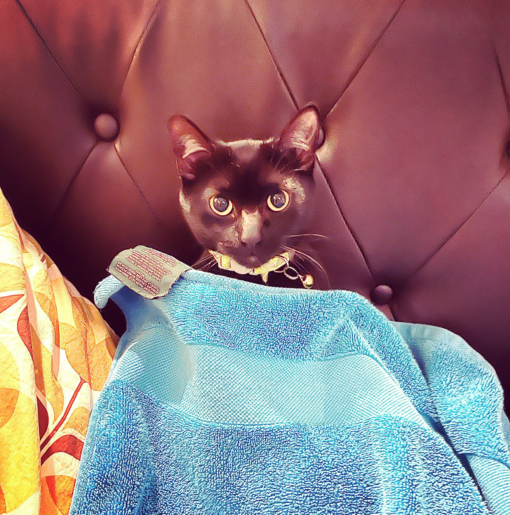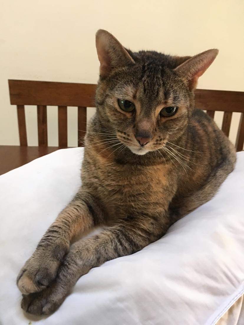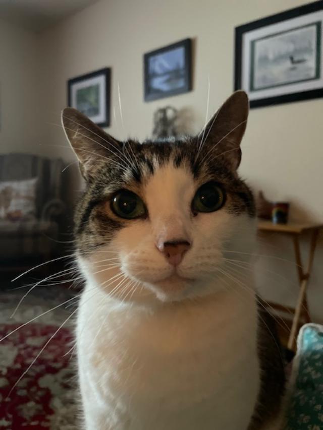 She is about a year old. Missing fur on her nose from a respiratory infection when she was a kitten (stray). Orange breakaway collar. Chipped. Very very shy.