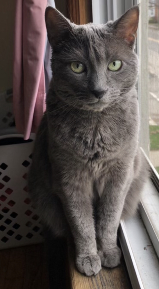 Exclusively indoor female, gray with soft white patches, one long patch on her nose. Friendly with people, very afraid of other pets. Spayed. Had on a blue collar with pink flowers on.