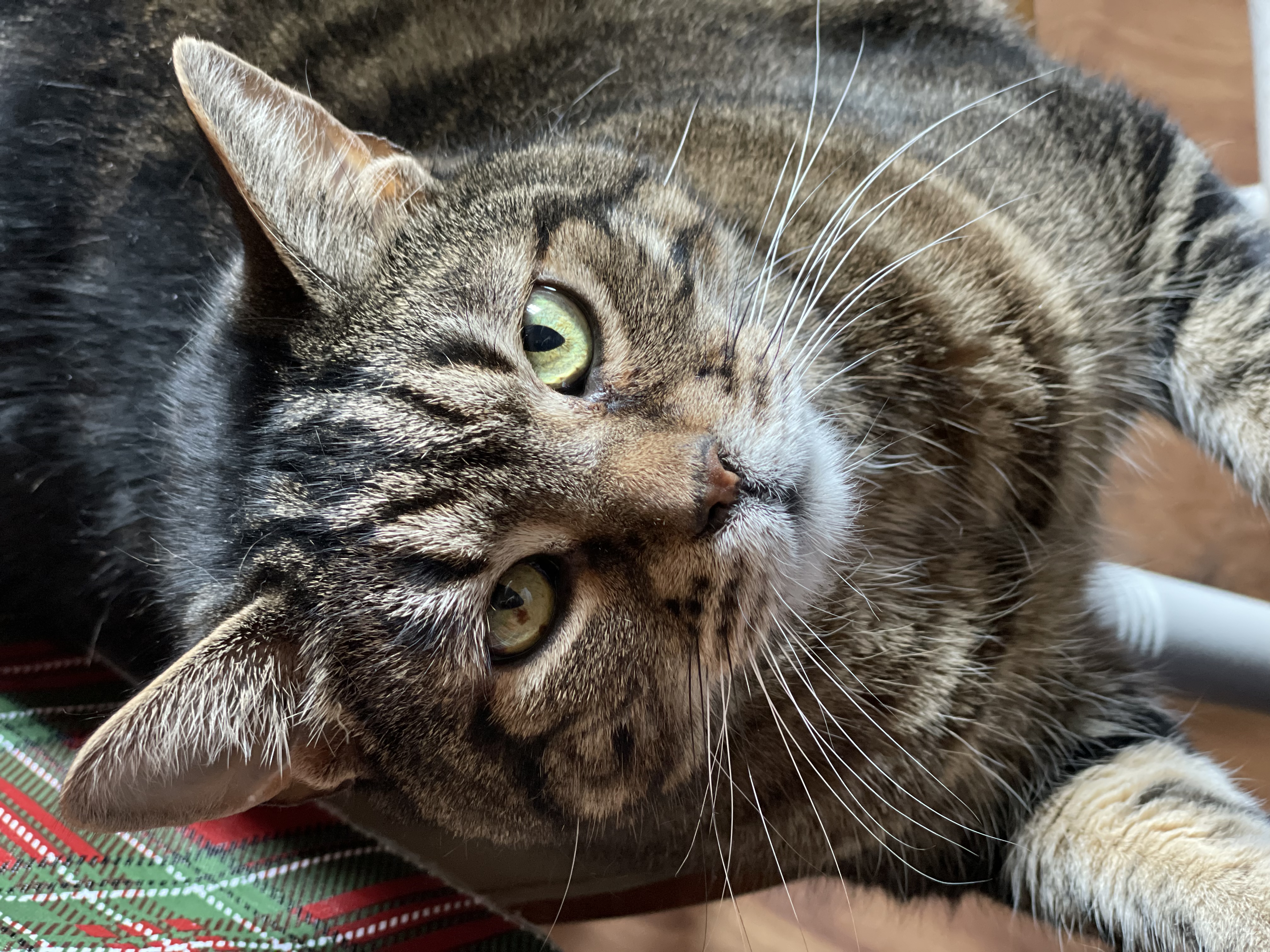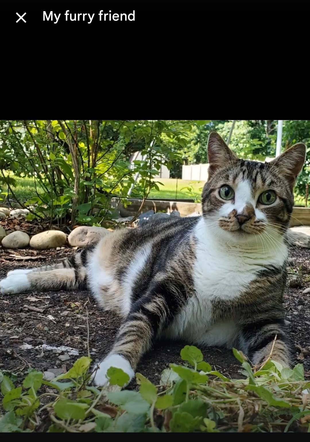 He is a friendly brown tabby. Indoor cat who escaped. Loves treats. Will come when called.