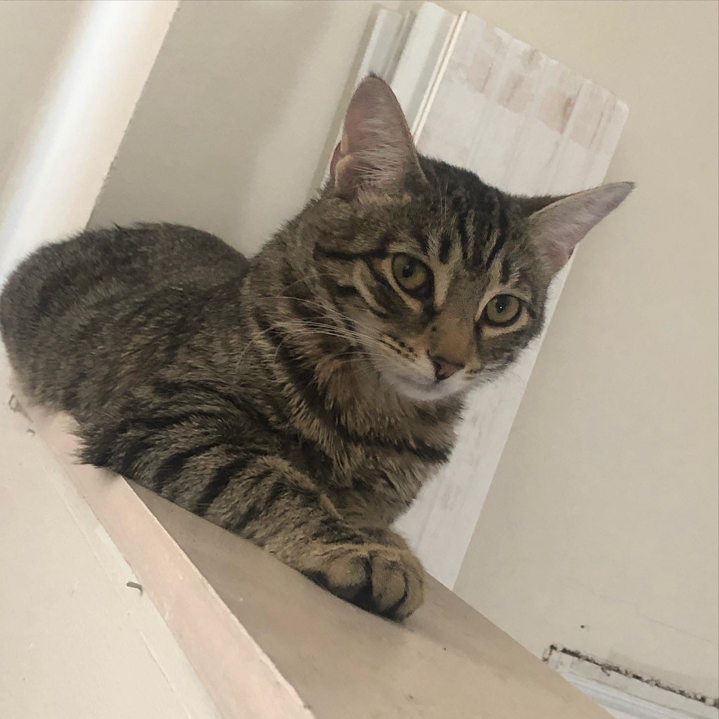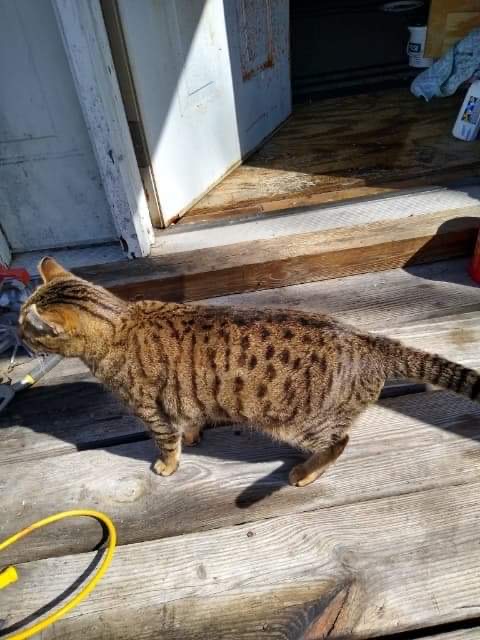He is male 3 1/2 years old, spayed, has hazel eyes, all white stomach and white paws. The rest of him is a brown grey with Black tiger stripes. He’s a tabby cat. Has a distinctive brown mole on his pink nose. White snout with a little white line between his eyes. He has cute