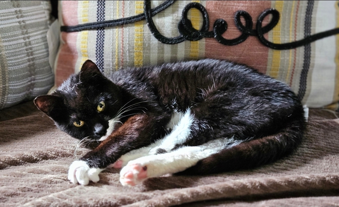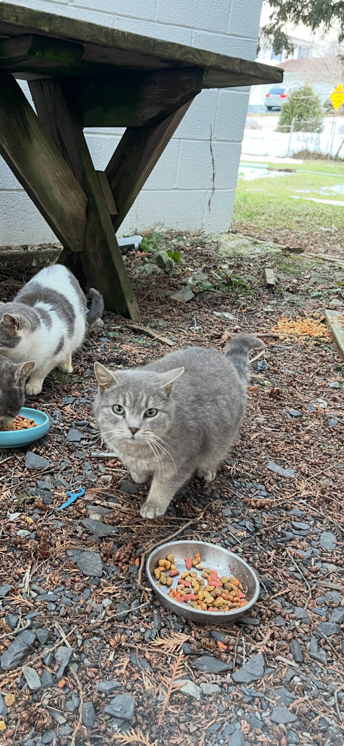 Zena is small and grey with very pretty eyes. She sometimes has clumps of hair on her back that are shedding. She is kind of fluffy and round. She is feral so she won’t come to you, but please let me know if you spot her.