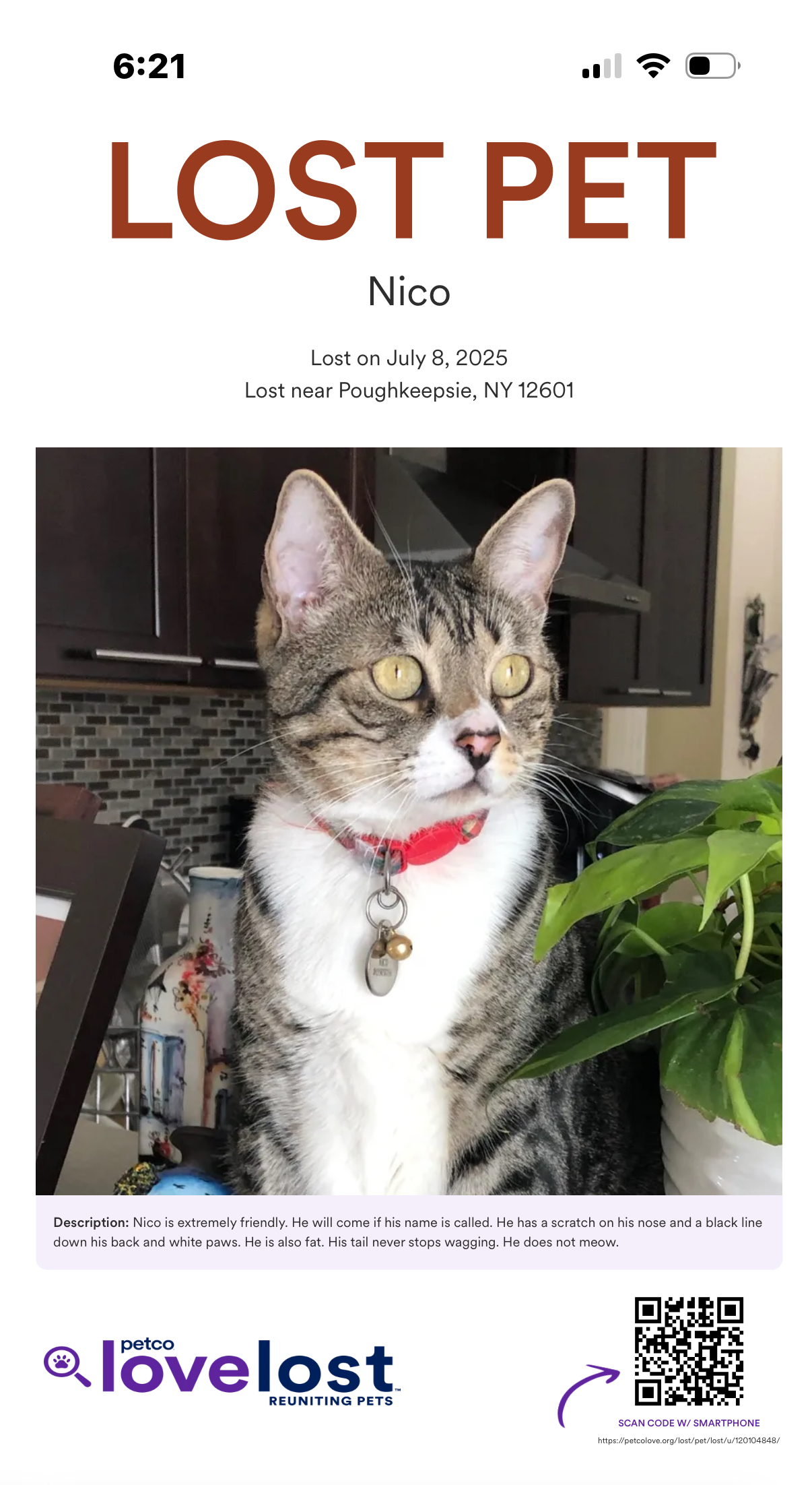 Nico is a gray tabby. He is extremely friendly and is not scared of humans. He ran outside our house July 8th in the Childrens home of poughkeepsie area by Waldorf/Lyford Ln and has not returned. He has big green eyes, a smaller head, a pink nose, a tail that never stops wagging and is
