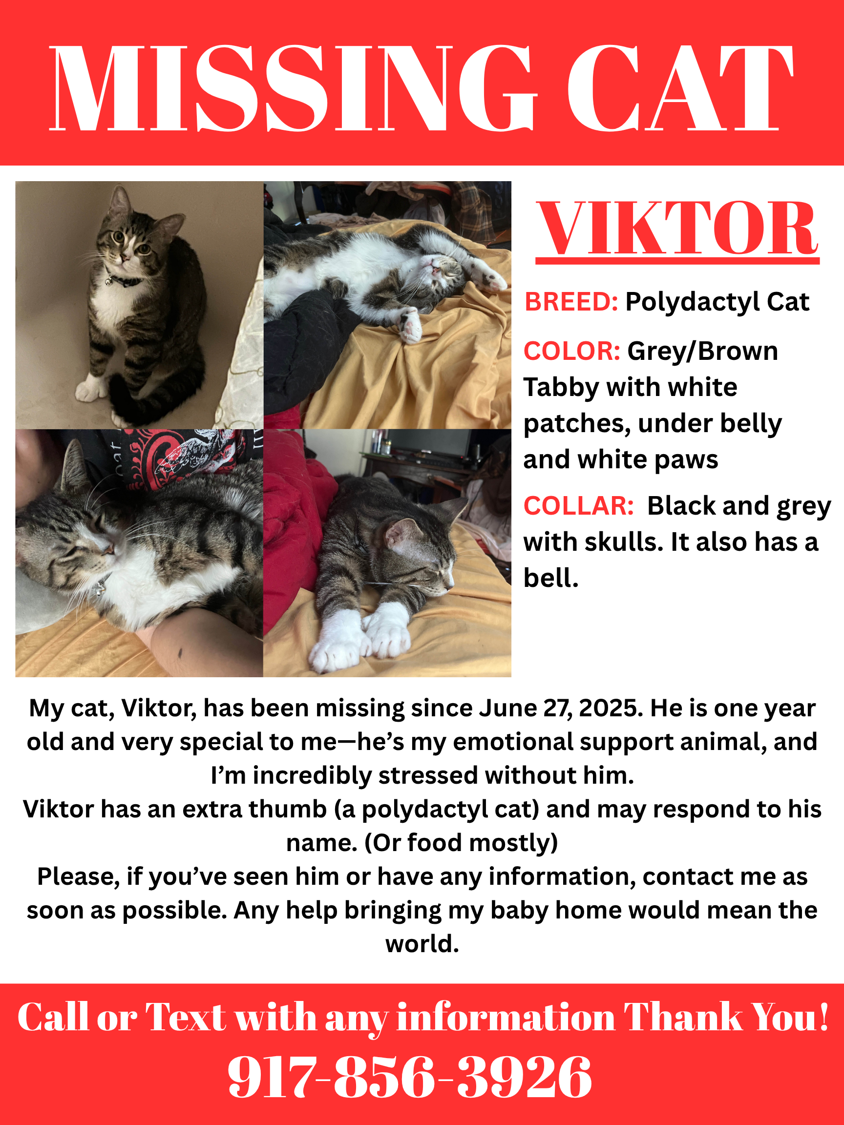 Please help me, my cat Viktor has gone missing, and I would greatly appreciate it if anyone has seen him. I'm in absolute distress and have been looking everywhere. He's a 1-year-old male polydactyl cat. I've attached images of what he looks like. He also had a skull collar on.
