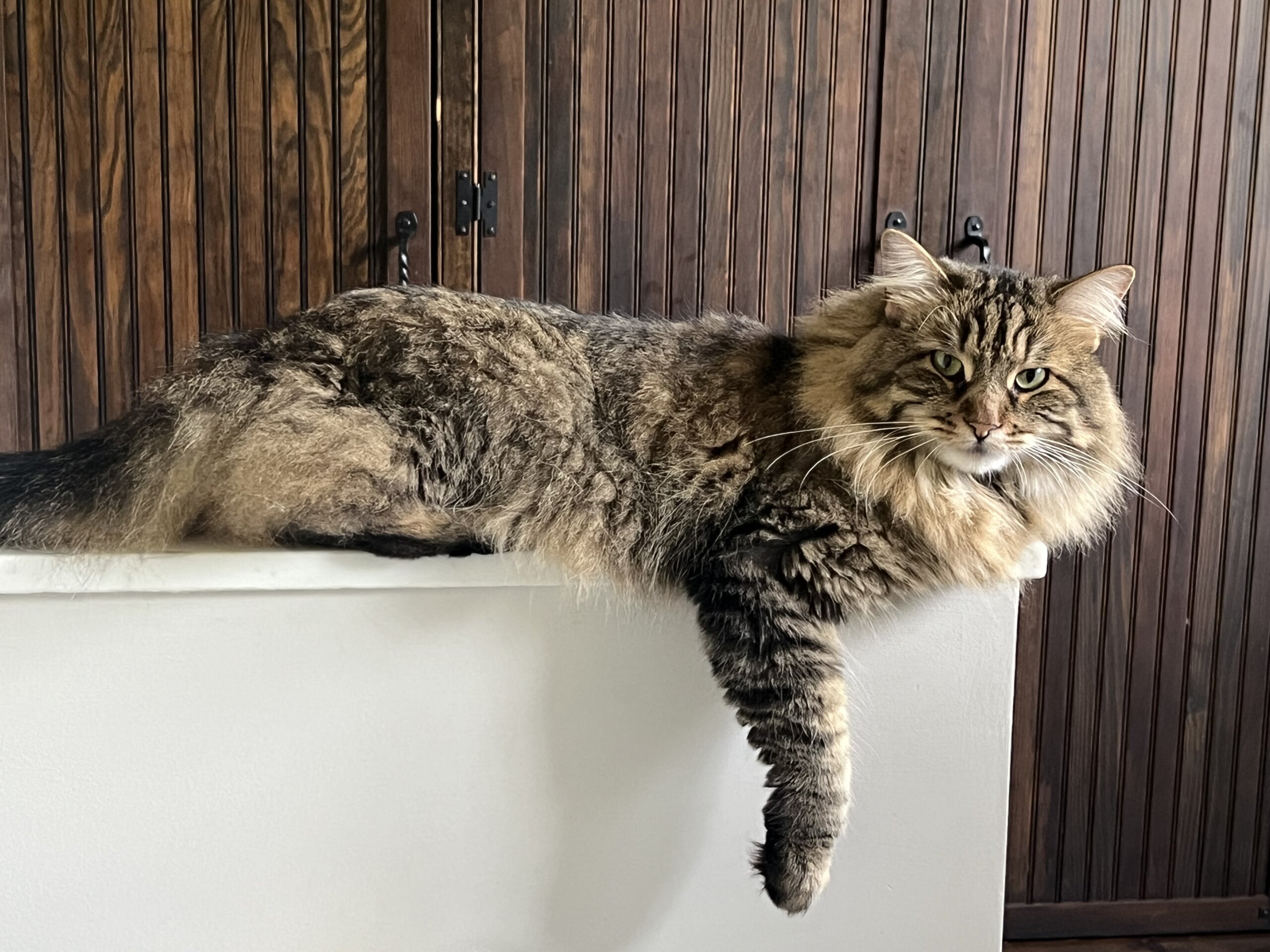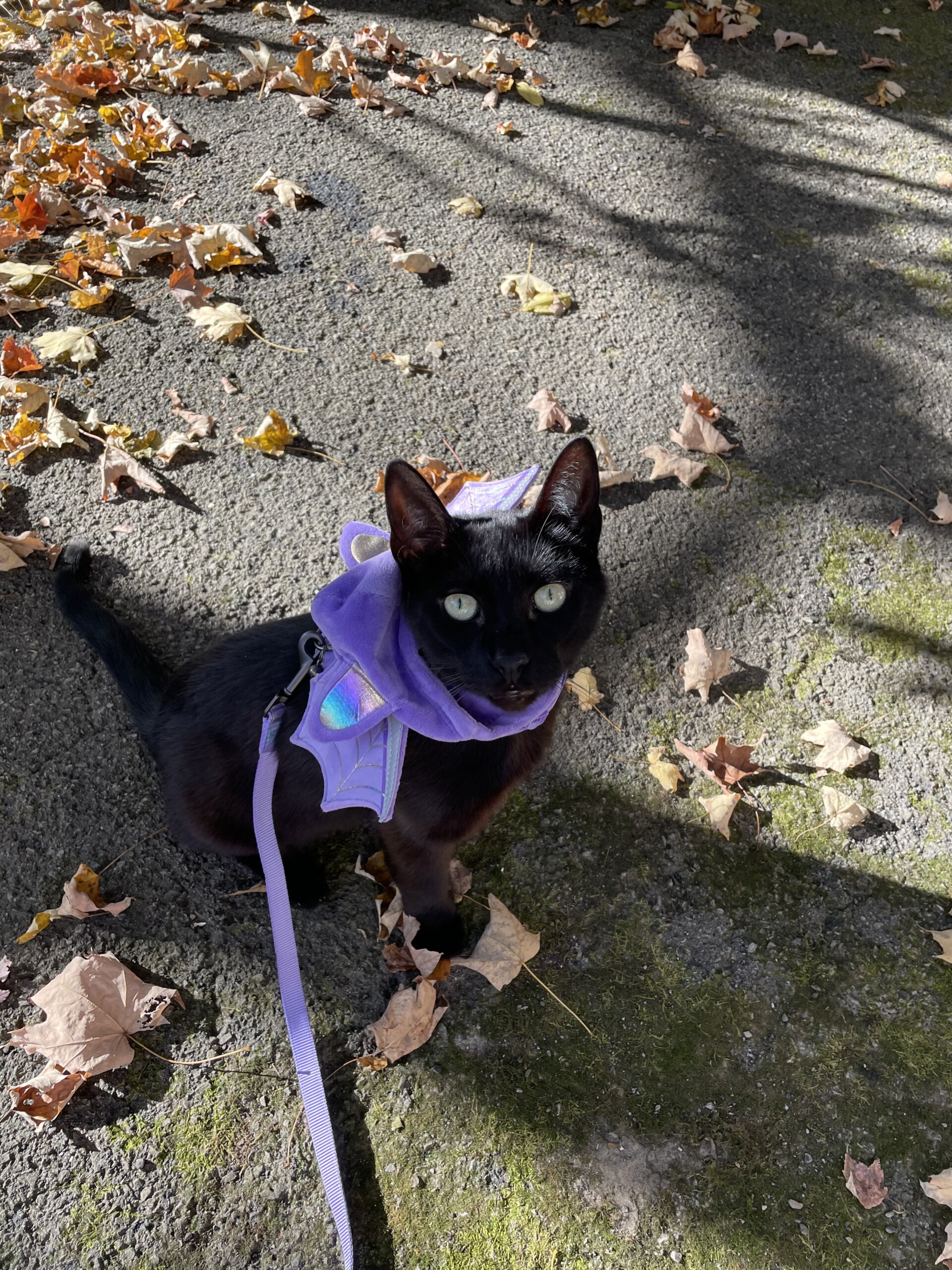Last wearing a flea & purple collar with silver paw prints on it, also has a VERY small amount of white furs on his chest.